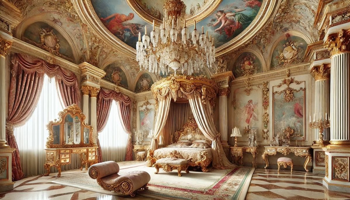 - Chi tiết tinh xảo: Giường ngủ và các nội thất khác được chạm khắc họa tiết hoa lá thủ công, tạo hiệu ứng nghệ thuật độc đáo. Các chi tiết mạ vàng trên khung giường và cột trụ được thực hiện bởi các nghệ nhân lành nghề, thể hiện sự tỉ mỉ và công phu trong từng đường nét. Trần nhà với hoa văn nghệ thuật, thảm trải sàn cao cấp, rèm cửa lụa, và gương khung vàng tăng thêm sự sang trọng cho không gian.