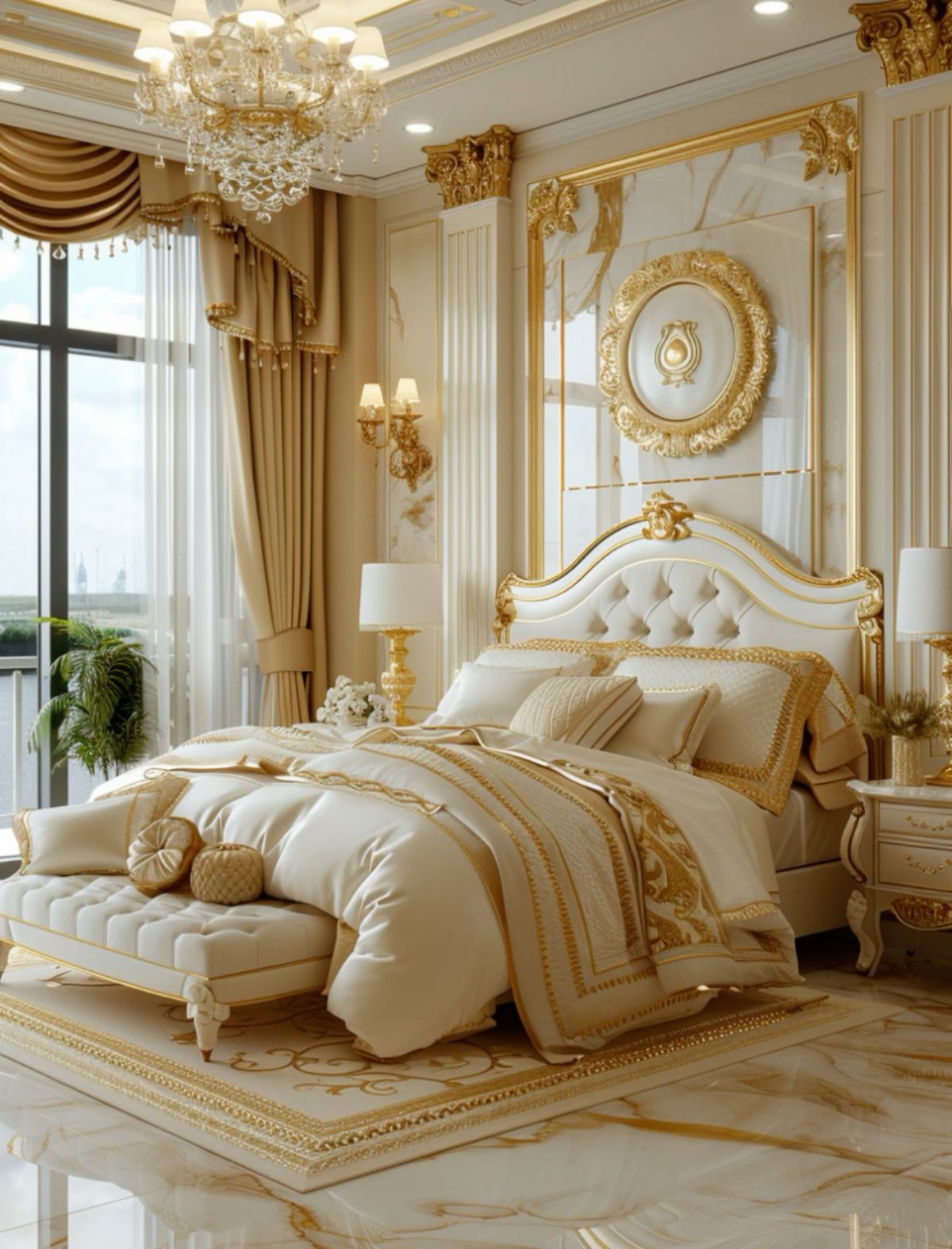 - Chất liệu cao cấp: Bộ giường phòng ngủ được làm từ gỗ tự nhiên nhập khẩu, với bề mặt sơn phủ màu trắng kết hợp vàng ánh kim, giữ nguyên vân gỗ tự nhiên, tạo nên vẻ đẹp ấm áp và sang trọng. Màn che và đệm bọc cao cấp, kết hợp khung mạ vàng, tăng thêm vẻ đẹp quý phái. Đèn chùm pha lê lớn và tranh tường cổ điển mang lại không khí hoàng gia.