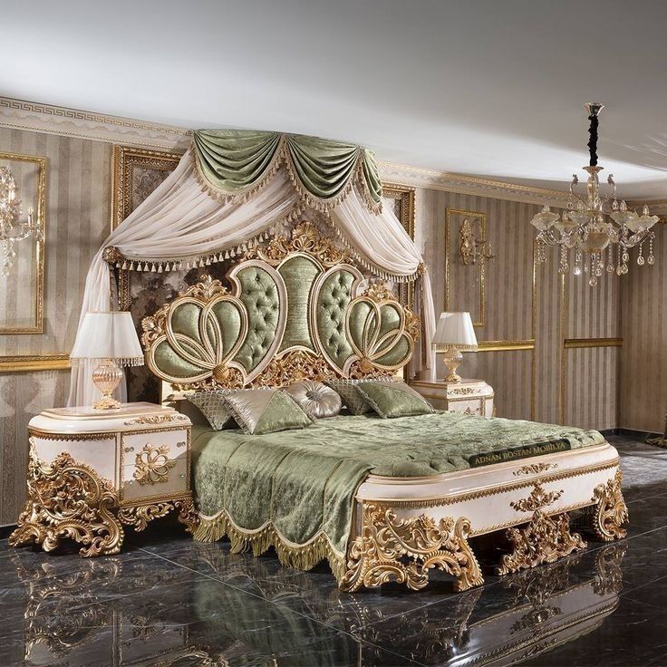 - Chất liệu cao cấp: Bộ giường phòng ngủ được làm từ gỗ tự nhiên nhập khẩu, với bề mặt sơn phủ màu xanh kết hợp vàng ánh kim, giữ nguyên vân gỗ tự nhiên, tạo nên vẻ đẹp ấm áp và ấn tượng. Màn che và đệm bọc cao cấp, kết hợp khung mạ vàng, tăng thêm vẻ đẹp quý phái. Đèn chùm pha lê lớn và tranh tường cổ điển mang lại không khí hoàng gia.