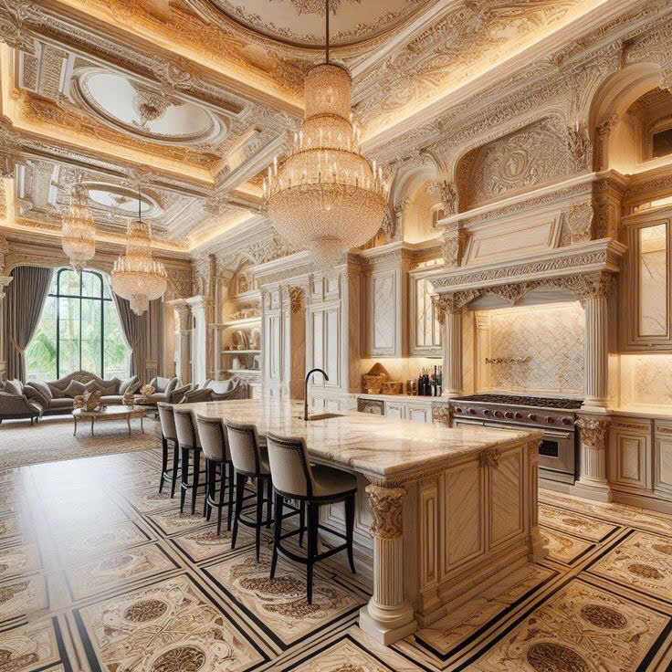 - Thiết kế tân cổ điển hoàng gia: Không gian bếp được thiết kế với phong cách hoàng gia, sử dụng tủ bếp làm từ gỗ tự nhiên cao cấp, kết hợp với các đường nét chạm khắc tinh xảo và khung mạ vàng ánh kim. Các chi tiết hoa văn cầu kỳ trên tủ bếp, trần nhà, và đảo bếp gợi lên hình ảnh cung điện hoàng gia, mang lại sự quyền uy và xa hoa.