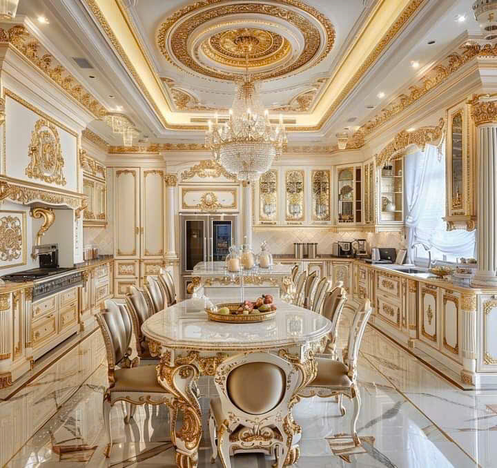 - Thiết kế tân cổ điển hoàng gia: Không gian bếp được thiết kế với phong cách hoàng gia, sử dụng tủ bếp làm từ gỗ tự nhiên cao cấp, kết hợp với các đường nét chạm khắc tinh xảo và khung mạ vàng ánh kim. Các chi tiết hoa văn cầu kỳ trên tủ bếp, trần nhà, và bàn ăn gợi lên hình ảnh cung điện hoàng gia, mang lại sự quyền uy và xa hoa.