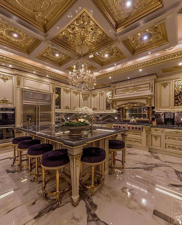 - Thiết kế tân cổ điển hoàng gia: Không gian bếp được thiết kế với phong cách hoàng gia, sử dụng tủ bếp làm từ gỗ tự nhiên cao cấp, kết hợp với các đường nét chạm khắc tinh xảo và khung mạ vàng ánh kim. Các chi tiết hoa văn cầu kỳ trên tủ bếp, trần nhà, và đảo bếp gợi lên hình ảnh cung điện hoàng gia, mang lại sự quyền uy và xa hoa.