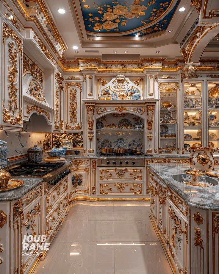 - Chi tiết tinh xảo: Tủ bếp có nhiều ngăn kéo và tủ lưu trữ được chạm khắc họa tiết hoa lá thủ công, tạo hiệu ứng nghệ thuật độc đáo. Các chi tiết mạ vàng trên tay nắm, cạnh tủ, và trần nhà được thực hiện bởi các nghệ nhân lành nghề, thể hiện sự tỉ mỉ và công phu trong từng đường nét. Không gian được trang trí thêm bằng đồ sứ cao cấp, tăng thêm sự tinh tế cho khu vực bếp.