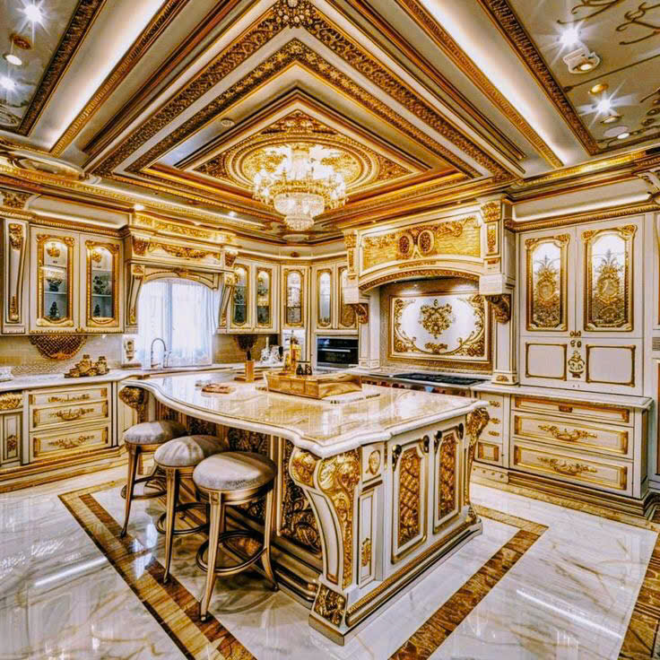 - Thiết kế tân cổ điển hoàng gia: Không gian bếp được thiết kế với phong cách hoàng gia, sử dụng tủ bếp làm từ gỗ tự nhiên cao cấp, kết hợp với các đường nét chạm khắc tinh xảo và khung mạ vàng ánh kim. Các chi tiết hoa văn cầu kỳ trên tủ bếp, trần nhà, và đảo bếp gợi lên hình ảnh cung điện hoàng gia, mang lại sự quyền uy và xa hoa.